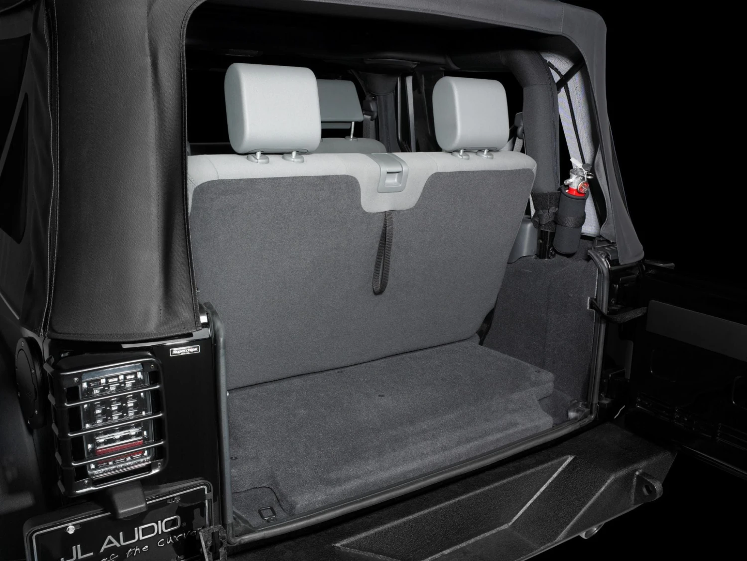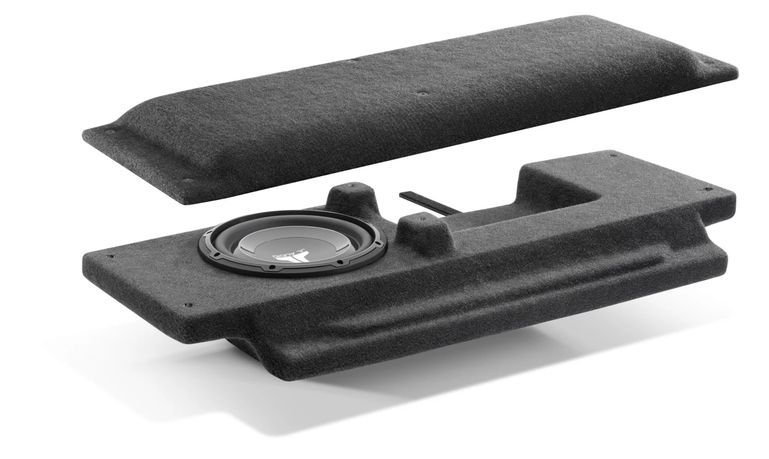 This low-profile Stealthbox® system sits inconspicuously on the cargo-area floor and features a rigid, carpet-covered, removable panel that conceals a powerful 10-inch Subwoofer and a secure mounting place for a JL Audio amplifier (sold separately). The Subwoofer is housed in a sealed, carpet-covered fiberglass enclosure. The entire structure is designed to be easily installed and removed when the tailgate is opened, so you can choose to remove it if you plan to get your Jeep really filthy or need the extra space.