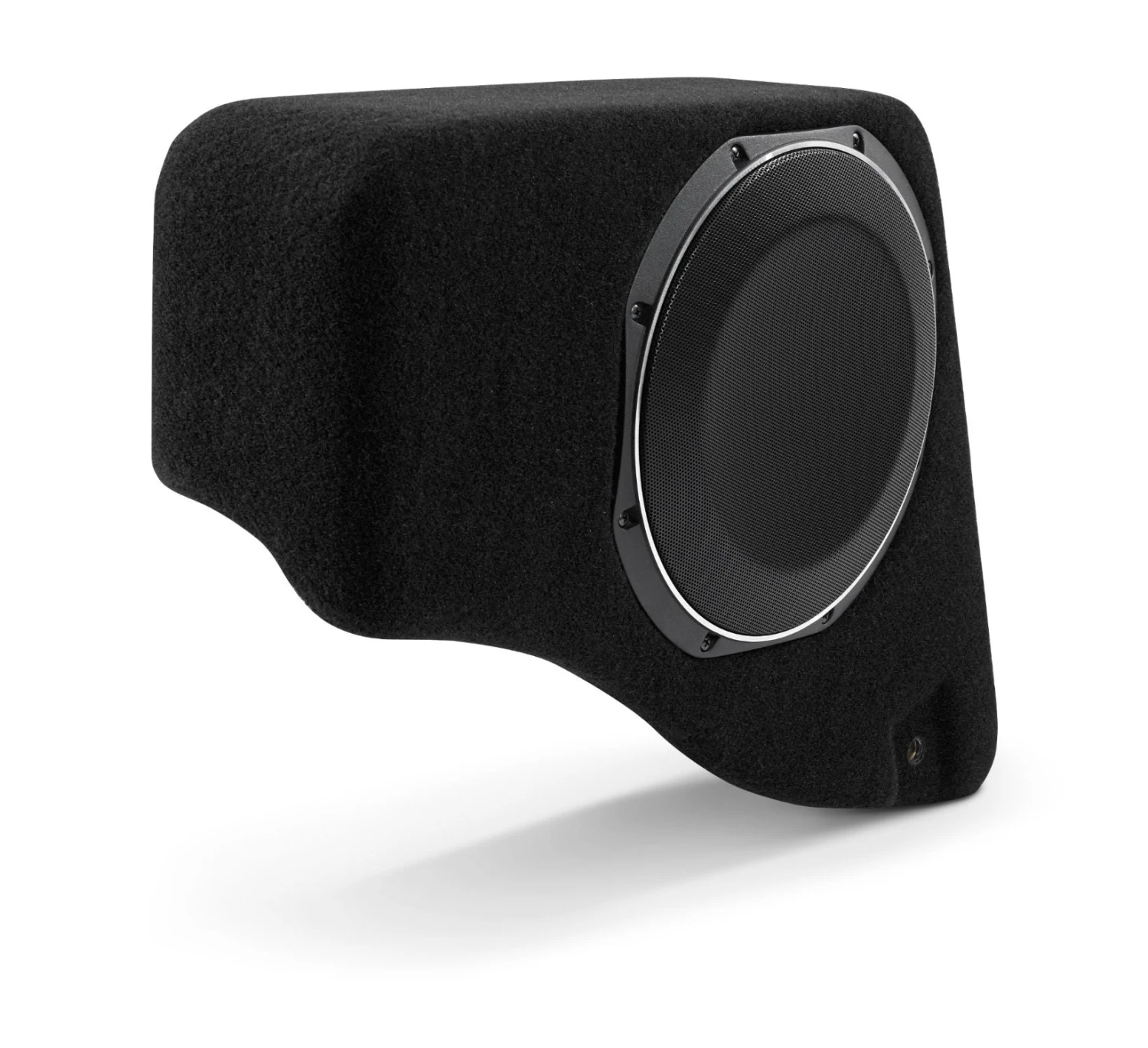 The Hard Data: Each system contains one 10TW1-4 in a sealed enclosure with 300 watt power handling. Each enclosure is wired for 4 ohms (using two achieves a 2 ohm load in parallel). A steel mesh grille is included with each to protect the Subwoofer. Each enclosure installs above one rear wheel well, with specific models for passenger and driver side. Does not affect hard top installation.