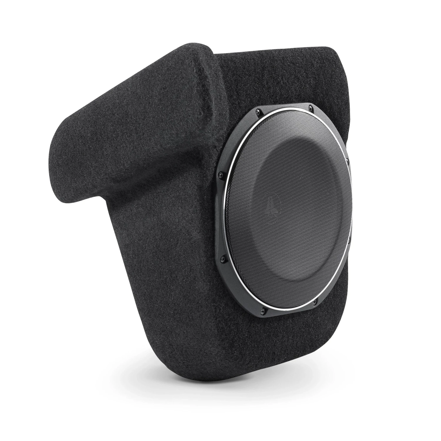 Featuring an all-fiberglass, custom-formed, sealed enclosure, this Stealthbox® houses an innovative, 10-inch TW1 thin-line subwoofer. Designed to drop into the driver’s side, rear storage compartment, this Stealthbox® solution produces amazing amounts of deep bass output, while practically vanishing into its surroundings.